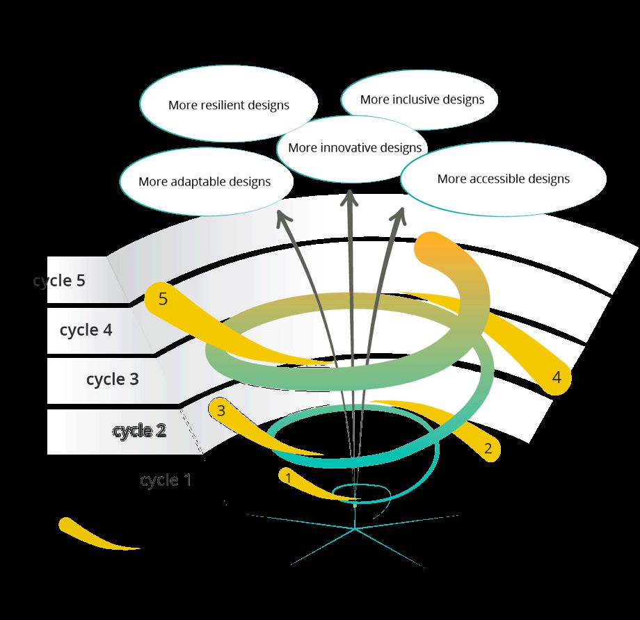 We have developed a process we call our “virtuous tornado,”adding more functional requirements and use scenarios at each cycle to expand the design. This way we remain responsive and agile and make more relevant progress that will have greater impact in the long run. Because we don’t iterate toward a single solution but toward a system that can provide an optimal configuration for each user, what we design is more dynamically resilient.